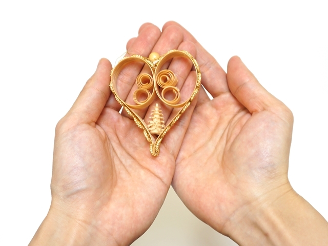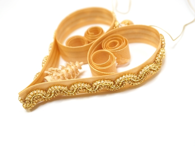 この経木のオーナメントは薄く削られた木を曲げたり巻いたりしてカットし、