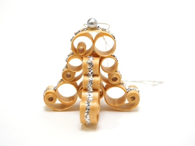 この経木のオーナメントは薄く削られた木を曲げたり巻いたりしてカットし、