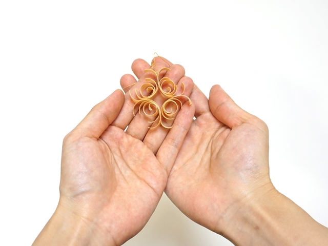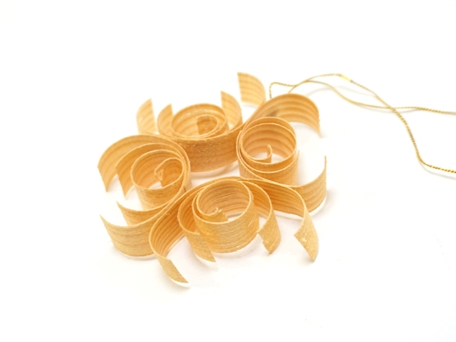 この経木のオーナメントは薄く削られた木を曲げたり巻いたりしてカットし、
