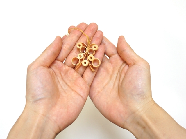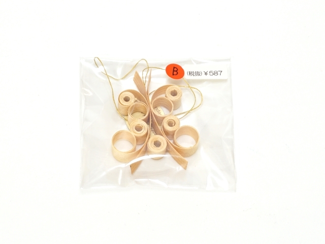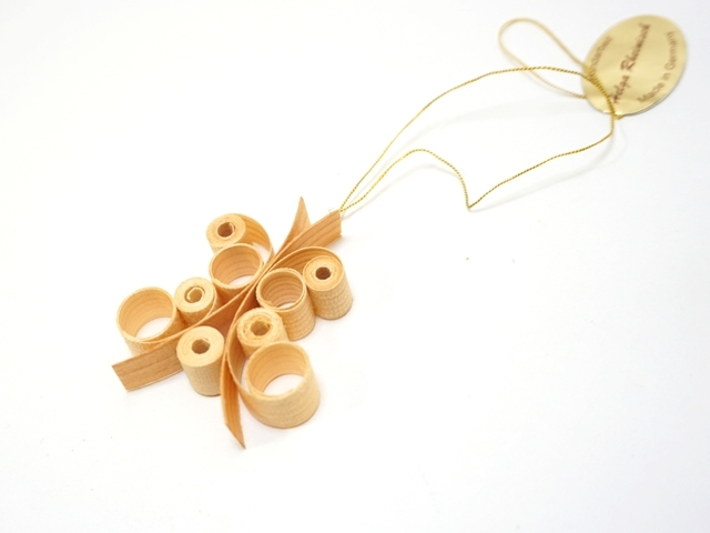 この経木のオーナメントは薄く削られた木を曲げたり巻いたりしてカットし、
